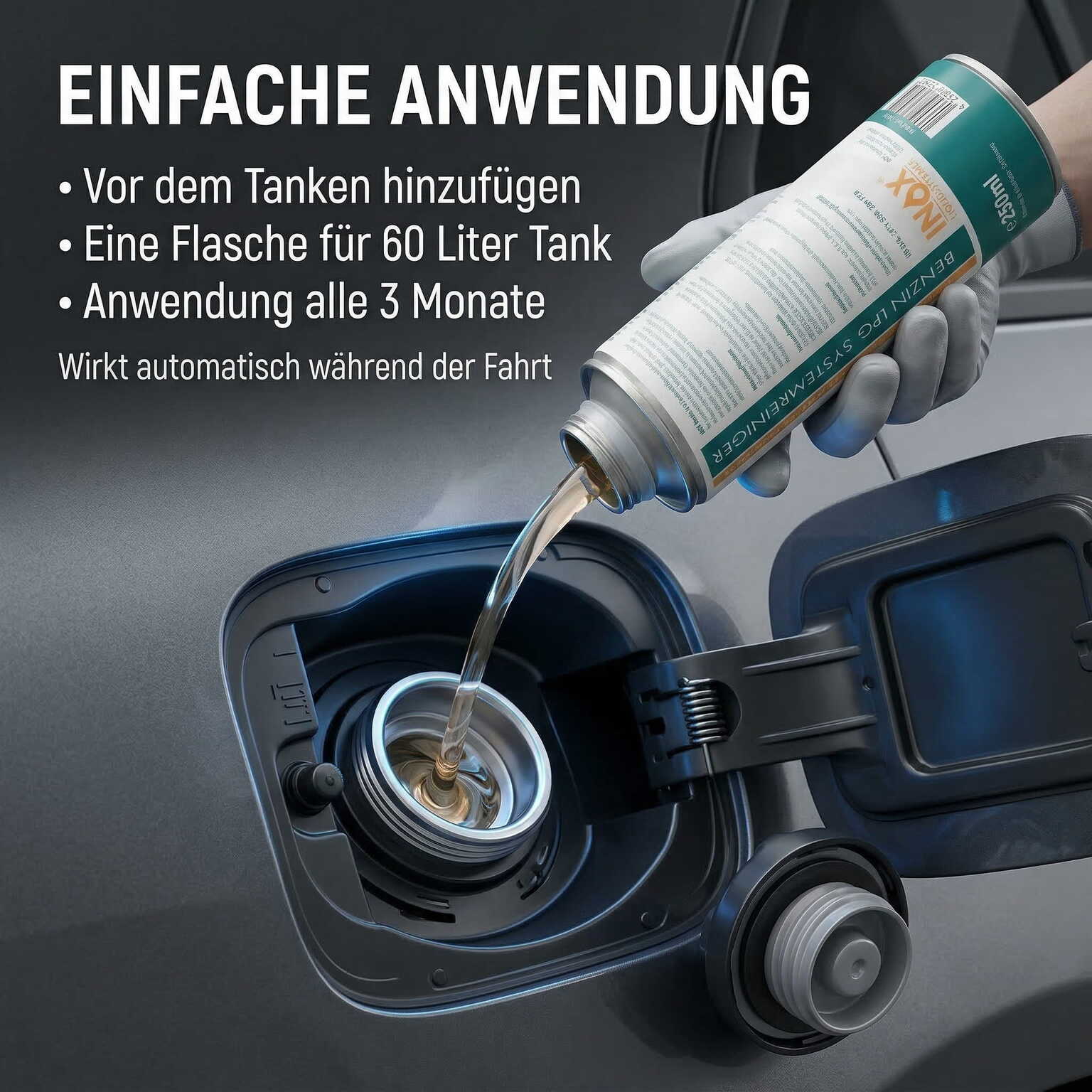 Anwendung: Fügen Sie das Additiv direkt in den Kraftstofftank ein. Mischungsverhältnis beachten: 250 ml reichen für bis zu 50 Liter Benzin-Flüssiggas. Regelmäßige Anwendung empfohlen, um Verschleiß & Korrosion nachhaltig zu vermeiden.
